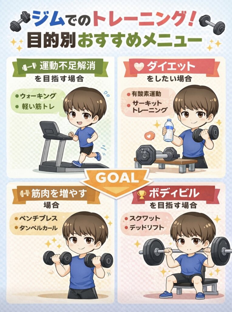 ジムでのトレーニングは目的によって最適なメニューが異なります。以下の目的別でおすすめのジムトレーニングメニューを紹介します。
