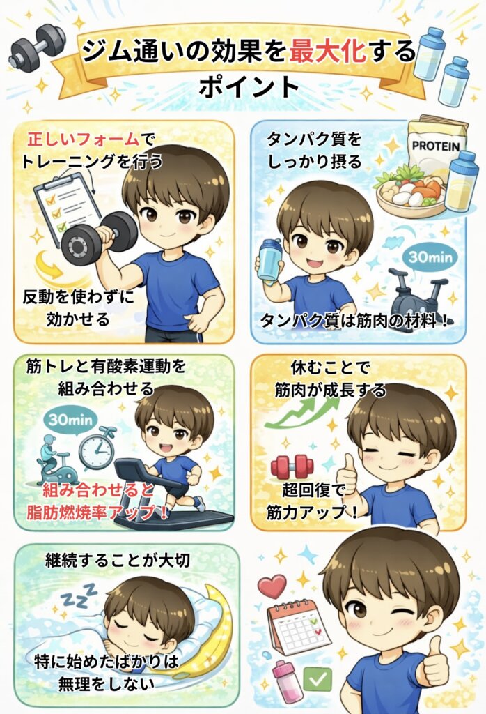 ジムトレーニングの効果を最大限に引き出すためには、ただ体を動かすだけでは不十分です。フォームや栄養、休養など、トレーニング以外の要素にも意識を向けることで成果につながりやすくなります。ジム通いの効果を最大化するためのポイントは以下のとおりです。