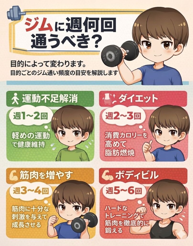 ジムに通い始めたものの「週に何回行けばいいの?」と悩んでいませんか?ジムに入会しても計画せずに通うと成果が出にくくなり、途中で挫折する原因にもなります。
