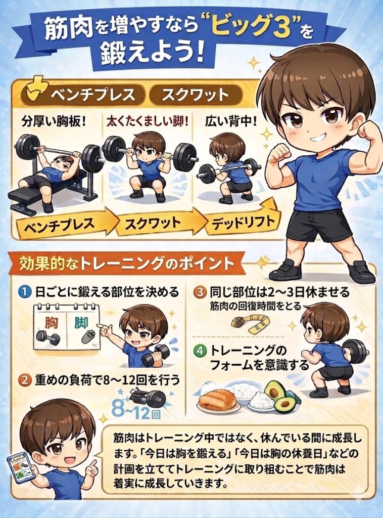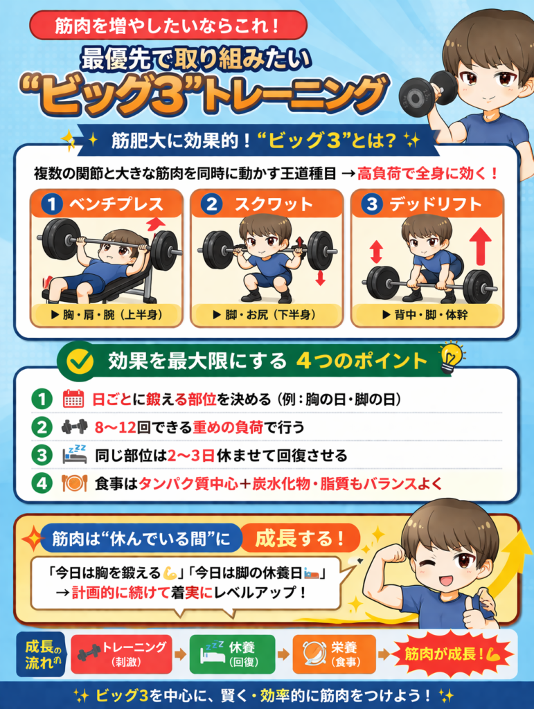 筋肉を増やしたい場合、ジムトレーニングメニューでは「ビッグ3」と呼ばれる以下の3種目がおすすめです。