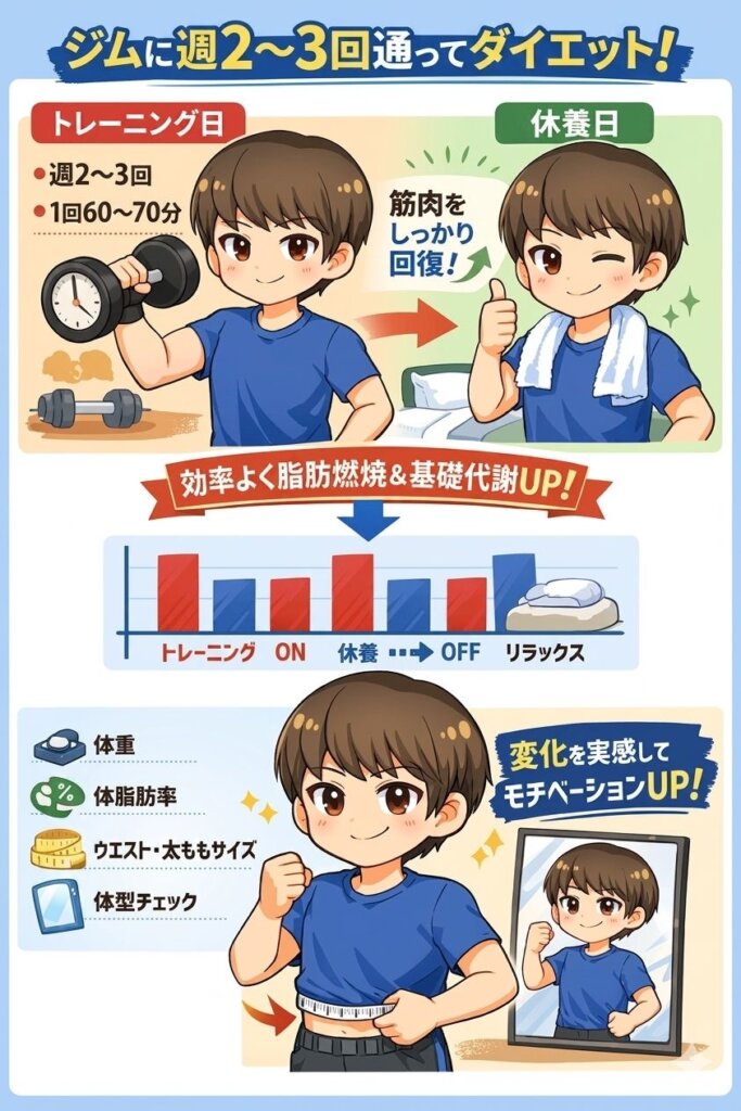 ダイエットでトレーニングの結果を出すには、ジムに週2〜3回のペースで通うことがおすすめです。脂肪を燃焼させながら基礎代謝を高めるには、トレーニング日と休養日を計画的に取り入れることが必要です。休養日を設けると筋肉が十分に回復し、次のトレーニング効果を高めてくれます。