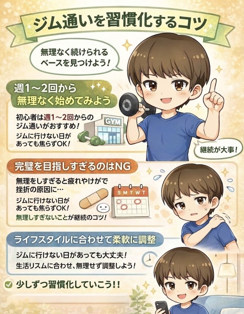 ジム通いを習慣化するコツは、自分に合った無理のない頻度を見つけることです。ジム通いの回数よりも継続することが結果につながります。完璧を目指して頑張りすぎると疲れやけがが原因で途中で挫折してしまうことがあります。
